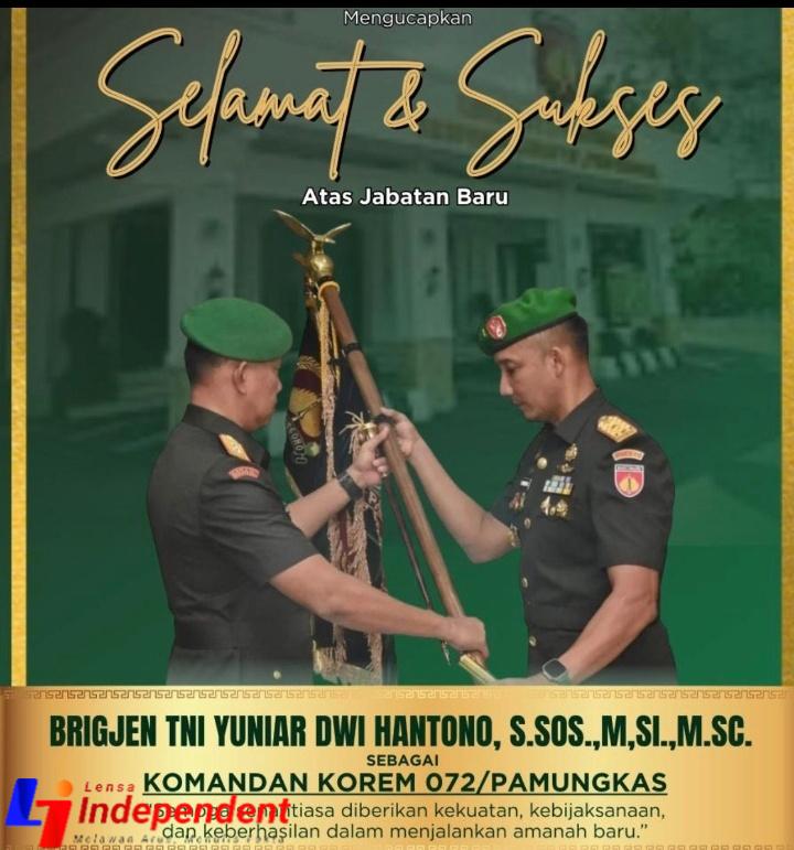 Yogyakarta – lensaindependent.com Tongkat komando Korem 072/Pamungkas resmi berganti. Brigjen TNI Yuniar Dwi Hantono, S.Sos., M.Si., M.Sc. kini menjabat sebagai Danrem 072/Pamungkas menggantikan Brigjen TNI Bambang Sujarwo, S.H., M.Sos., M.M.