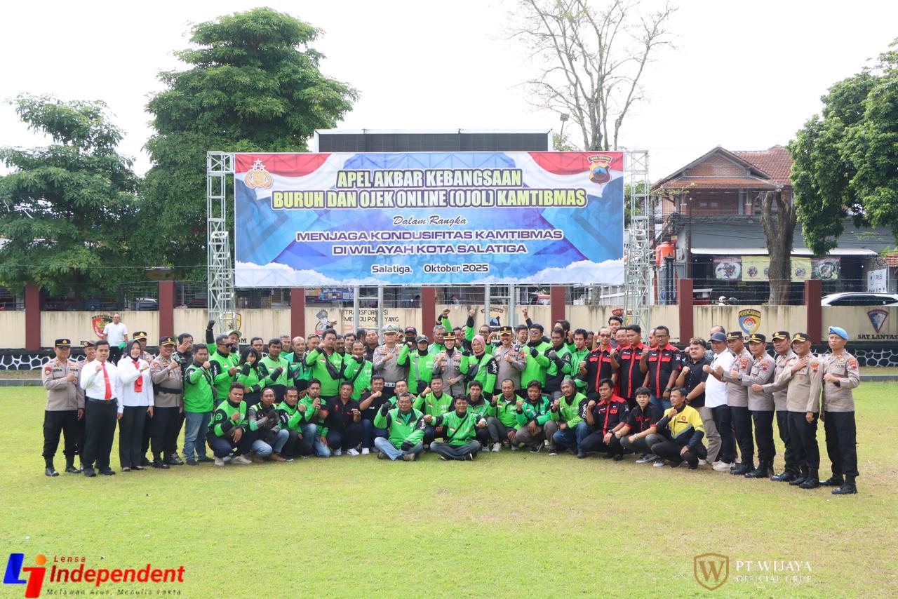 Polres Salatiga Polda Jateng – Kapolres Salatiga AKBP Veronica S.H., S.I.K., M.Si. memimpin Apel Akbar Kebangsaan Buruh dan Ojek Online (Ojol) Kamtibmas dalam rangka menjaga kondusifitas keamanan dan ketertiban masyarakat (Kamtibmas) di wilayah Kota Salatiga. Kegiatan ini digelar di Lapangan Bhayangkara Polres Salatiga, pada Senin (27/10/2025).