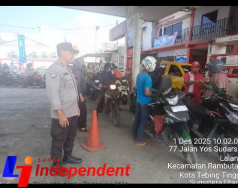 Bhabinkamtibmas Polsek Rambutan Polres Tebing Tinggi Aiptu HR Hutapea melaksanakan patroli doalogis di SPBU Simpang Beo Jalan Yos Sudarso Kota Tebing Tinggi sekaligus menghimbau masyarakat yang sedang antre untuk pengisian BBM, Senin (1/12/2025).